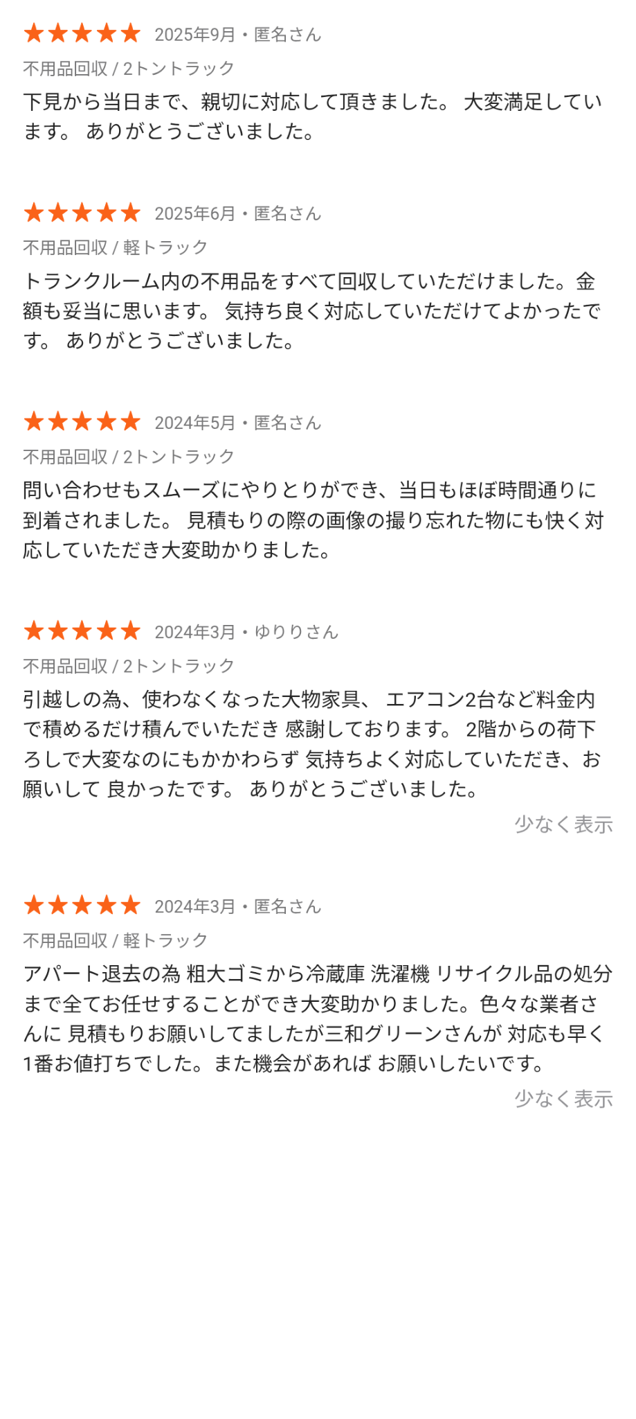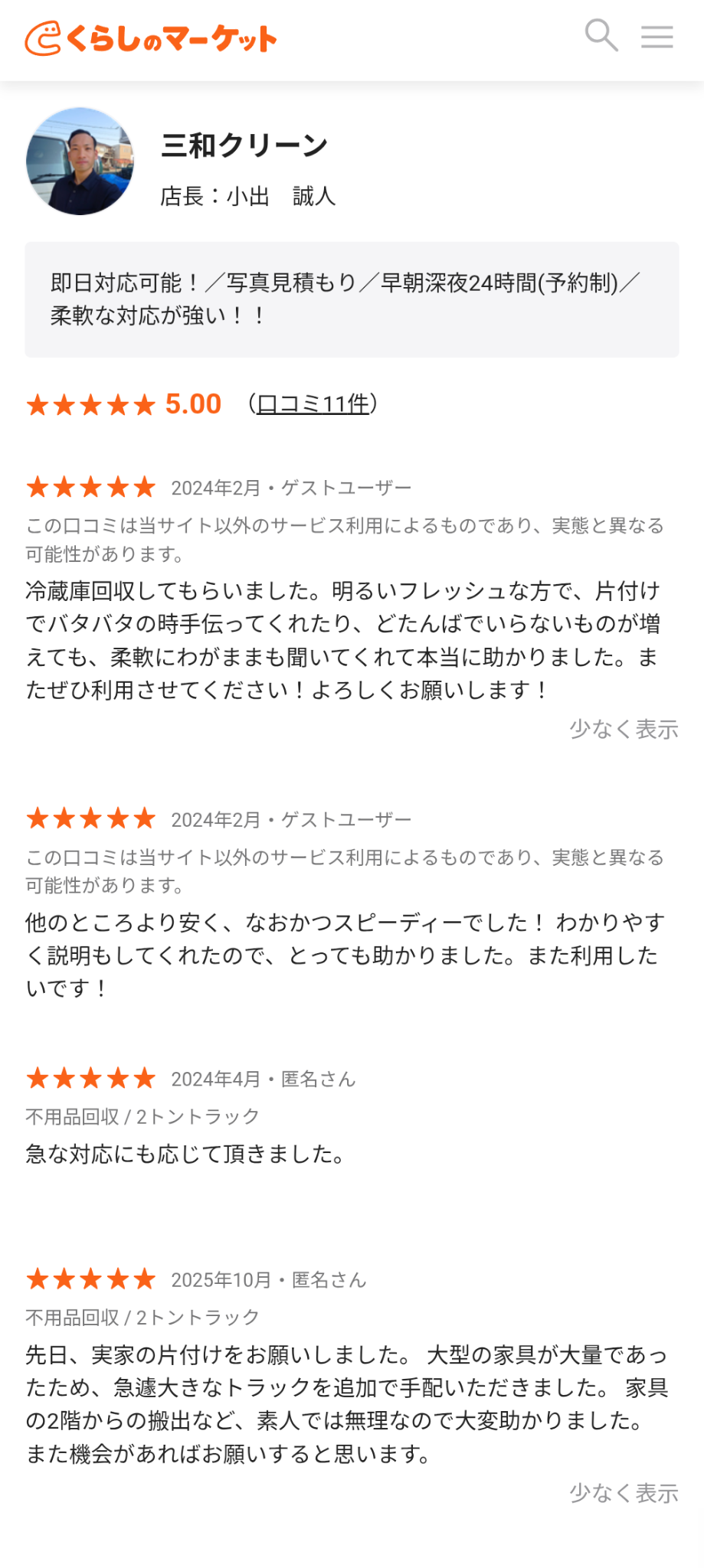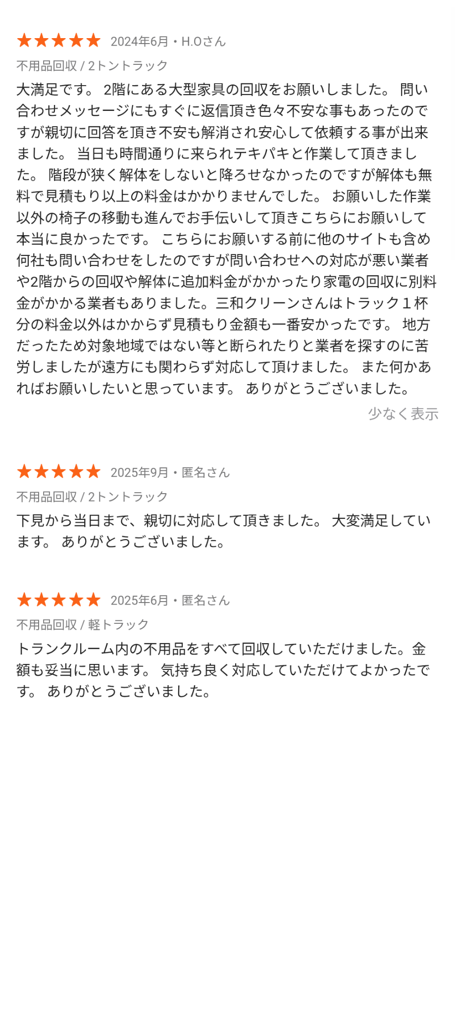 当日に急な時間変更してしまいましたが、すぐに対応していただき本当に助かりました! メールの返信も早く、作業もとてもスピーディーで笑顔の爽やかな、とても好印象の方でした! また回収物があるときは、美和クリーンさんにお願いしようと思います!